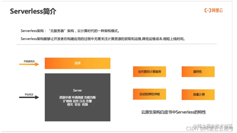 Serverless 顾名思义,是一种“无服务器”架构,因为屏蔽了服务器的各种运维复杂度,让开发人员可以将更多精力用于业务逻辑设计与实现。在 Serverless 架构下,开发者只需要关注于上层应用逻辑的开发,而诸如资源申请,环境搭建,负载均衡,扩缩容等等服务器相关的复杂操作都由平台来进行维护。在云原生架构白皮书中,对Serverless 的特性有以下概括: