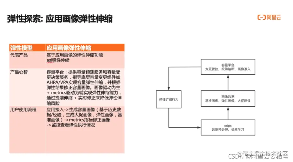 最后介绍一下应用画像弹性伸缩,其主要用于互联网公司内部,如阿里 ASI 容量平台。容量平台提供容量预测服务和容量变更决策服务,指导底层容量变更组件如 AHPA/VPA 实现容量弹性伸缩,并根据弹性结果修正容量画像。以画像驱动为主 + 指标驱动为辅实现弹性伸缩能力,通过提前伸缩 + 实时修正来降低弹性伸缩风险。整个弹性伸缩会借助odps和机器学习能力对实例监控等数据进行处理并产生应用画像,如基准画像,弹性画像,大促画像等,并借助容量平台来完成画像注入,变更管控和故障熔断等操作。用户使用流程为应用接入,基于历史数据/经验生成对应的容量画像,实时监控指标修正画像,并监控查看弹性执行情况。