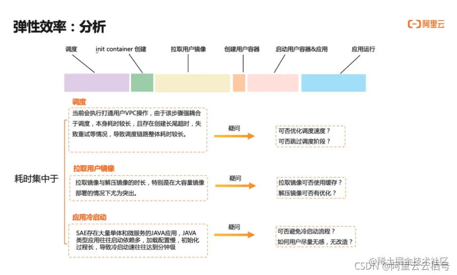 由此产生的疑问是可否优化调度速度?可否跳过调度阶段 ? 而对于拉取用户镜像,其包含拉取镜像与解压镜像的时长,特别是在大容量镜像部署的情况下尤为突出。优化的思路在于拉取镜像是否可以优化使用缓存,解压镜像是否可以优化。而对于应用冷启动,SAE 存在大量单体和微服务的 JAVA 应用,JAVA 类型应用往往启动依赖多,加载配置慢,初始化过程长,导致冷启动速往往达到分钟级。优化的方向在于可否避免冷启动流程并使用户尽量无感,应用无改造。
