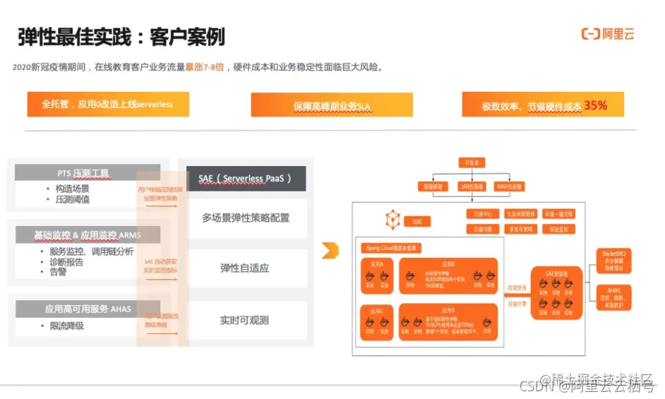 最后分享一个采用 SAE 弹性伸缩功能的客户案例,在 2020 新冠疫情期间,某在线教育客户业务流量暴涨 7-8 倍,硬件成本和业务稳定性面临巨大风险。如果此时采用传统的 ECS 架构,客户就需要在非常短的时间内做基础设施的架构升级,这对用户的成本及精力都是非常大的挑战。但如果采用 SAE,用户 0 改造成本即可享受 Serverless 带来的技术红利,结合SAE的多场景弹性策略配置,弹性自适应和实时可观测能力,保障了用户应用在高峰期的业务 SLA,并且通过极致弹性效率,节省硬件成本达到 35%。