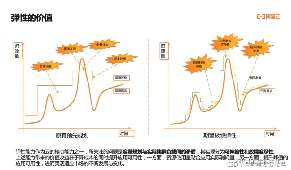 弹性能力作为云的核心能力之一,所关注的问题是容量规划与实际集群负载间的矛盾,通过两幅图的对比可以看到,如果采用预先规划的方式进行资源安排,会由于资源准备量和资源需求量的不匹配导致资源浪费或者资源不足的情况,进而导致成本上的过多开销甚至业务受损,而我们期望极致弹性能力,是准备的资源和实际需求的资源几乎匹配,这样使得应用整体的资源利用率较高,成本也随业务的增减和相应的增减,同时不会出现因容量问题影响应用可用性的情况,这就是弹性的价值。