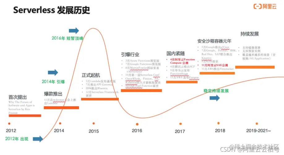 回顾整个 Serverless 的发展历程,我们可以看到从 2012 年首次提出 Serverless 概念为起点,再到 AWS 推出 Lambda 云产品的这段时间内,人们对 Serverless 的关注度出现了爆发式的增长,对无服务器的期待和畅想逐渐引爆整个行业,但 Serverless 的推广和生产落地的过程却不容乐观,Serverless 理念与实操生产的过程中存在 Gap,挑战着人们固有的使用体验和习惯。