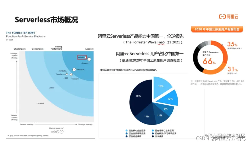 就当前 Serverless 整个市场格局而言,阿里云已经做到了 Serverless 产品能力中国第一,全球领先,在去年 Forrester 评测魔力象限中可以明显的看到阿里云在 Serverless 领域已经与 AWS 不相上下,于此同时,阿里云 Serverless 用户占比中国第一,在 2020 年中国云原生用户调研报告中整个阿里云 Serverless 用户占比已经达到了66%,而在 Serverless 技术采用情况的调研中表明,已经有越来越多的开发者和企业用户将 Serverless 技术应用于核心业务或者将要应用于核心业务之中。