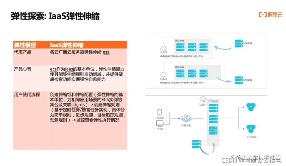 首先是 IaaS 弹性伸缩,其代表产品是各云厂商云服务器弹性伸缩,如阿里云ess,可以通过配置云监控的告警规则来触发相应的 ECS 增减操作,同时支持动态增减 Slb 后端服务器和 Rds 白名单来保证可用性,通过健康检查功能实现弹性自愈能力。ESS 定义了伸缩组的概念,即弹性伸缩的基本单位,为相同应用场景的 ECS 实例的集合及关联 Slb,Rds, 同时支持多种伸缩规则,如简单规则,进步规则,目标追踪规则,预测规则等,用户的使用流程为创建伸缩组和伸缩配置,创建伸缩规则,监控查看弹性执行情况。