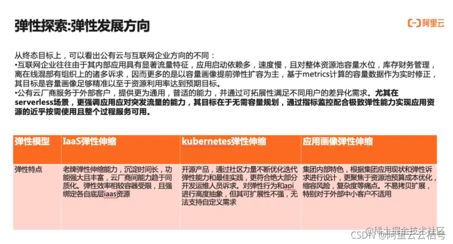 - 公有云厂商服务于外部客户,提供更为通用,普适的能力,并通过可拓展性满足不同用户的差异化需求。尤其在 Serverless 场景,更强调应用应对突发流量的能力,其目标在于无需容量规划,通过指标监控配合极致弹性能力实现应用资源的近乎按需使用且整个过程服务可用。