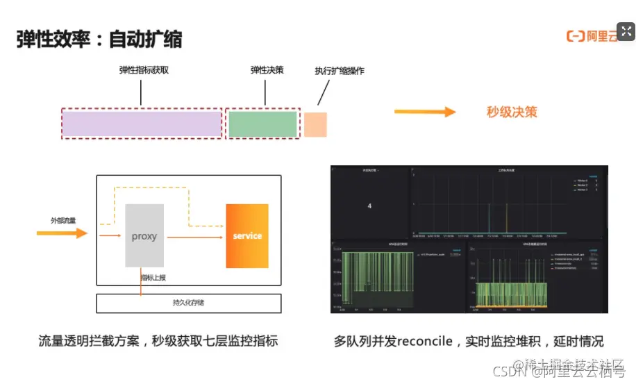 除了对整个应用生命周期的效率进行优化外,SAE 也对弹性伸缩进行了优化,整个弹性伸缩流程包括弹性指标获取,指标决策以及执行弹性扩缩操作三部分。对于弹性指标获取,基础监控指标数据已经达到了秒级获取,而对于七层的应用监控指标,SAE 正在规划采用流量透明拦截的方案保证指标获取的实时性。而弹性决策阶段,弹性组件启用了多队列并发进行 Reconcile,并实时监控队列堆积,延时情况。