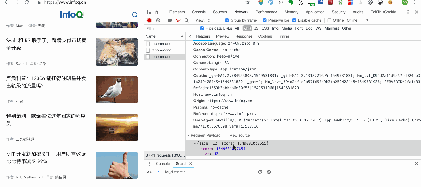 首先让我分析一下,这个推荐内容部分都有哪些请求,经过查看发现在链接www.infoq.cn/public/v1/m…里面有我们需要的内容 很明显这是一个ajax请求的页面,然后就是分析这个链接的请求方式和请求参数了 请求链接我们已经知道了,然后看请求参数部分经过观察我们发现请求参数的格式为