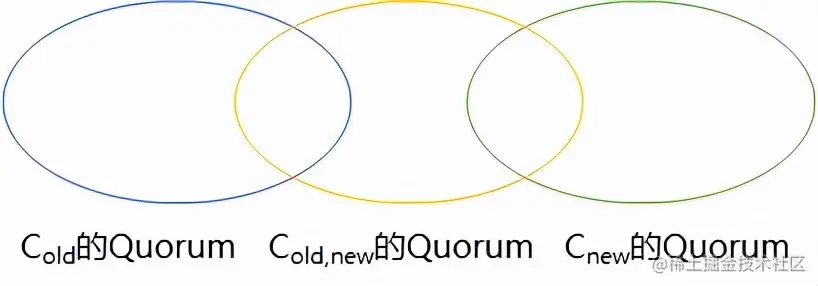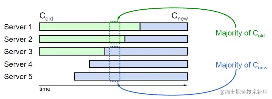 如果将成员变更当成一般的一致性问题,成员变更过程中,各节点从旧成员配置Cold切换到新成员配置Cnew的时刻可能有差异,可能在某一时刻Cold和Cnew中同时存在两个不相交的多数派,形成双Quorum,破坏一致性。