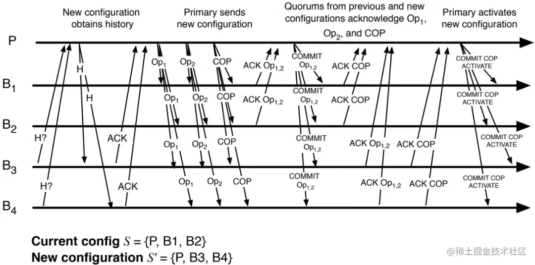 初始化:为了让新节点追上最新数据,新成员配置S’中的新节点B3、B4先连接到当前的主节点P,P会向它们传输自己当前的状态作为他们的初始状态。在Zab协议中当备节点连接上主节点时这样的状态传输就会自动发生,并且会继续从主节点P接收所有后续的操作日志(例如图中的Op1和Op2),这个过程中节点B3、B4不参与投票。