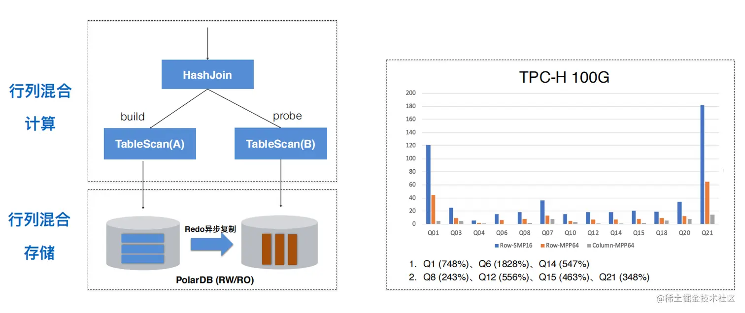 除此之外,就是提高存储方面的性能。从技术角度看,单独做一个行存、列存都不难,难的是做一个能够实时更新的列存。PolarDB-X采用的方案是在写入节点用行存,在只读节点用列存,中间通过redo做异步复制,实现列存的实时更新。基于这样的架构,就可以实现行列混存,行存承担高并发写入,列存承担复杂查询。结合MPP、行列混存、向量化等技术,PolarDB-X实现了TPC-H场景的5-10倍的性能提升。这一成果也即将在公有云上线,敬请期待。