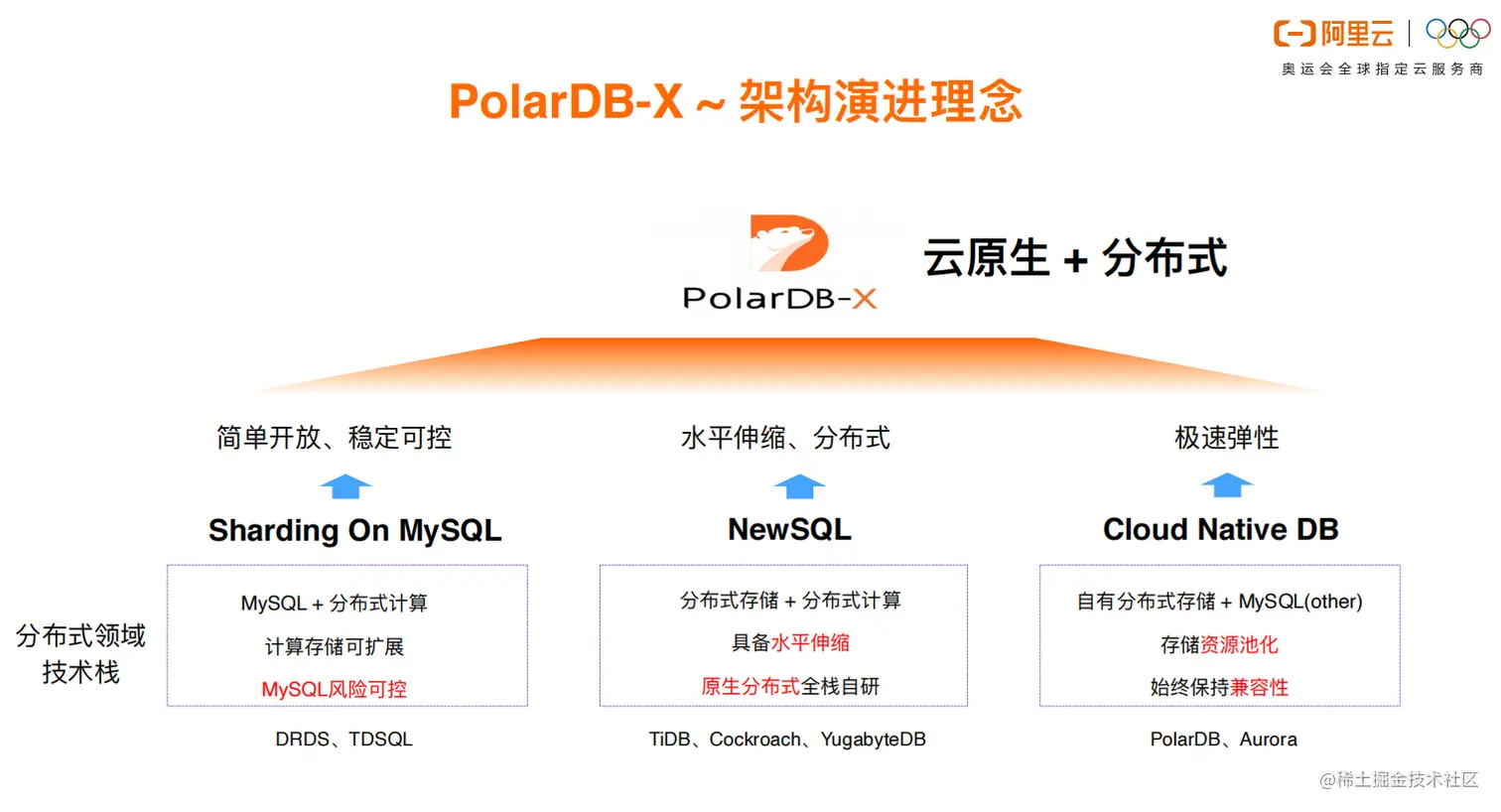 PolarDB-X结合了Sharding On MySQL、NewSQL、Cloud Native DB几种数据库理念的精华,具有云原生分布式的特性,底层使用了PolarDB云原生数据库的技术,上层用到了很多分布式技术。
