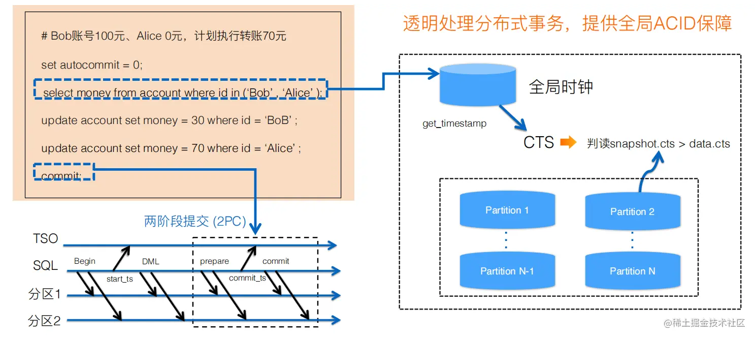 用TSO技术有一个必须要解决的问题——通常会增加几十微秒到几百微秒的RT。因此,PolarDB-X实现了一阶段提交、2PC的异步提交等优化,能够尽量克服TSO带来的性能损失。