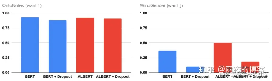 - 即使在进行看似无害的配置更改时也要小心:神经网络模型训练由许多超参数控制,这些超参数通常被选择以最大化某些训练目标。虽然配置选择通常看起来无害,但我们发现它们可能会导致性别相关性的显着变化,无论好坏。例如,使用dropout 正则化来减少过拟合通过大型模型。当我们增加用于预训练 BERT 和 ALBERT 的辍学率时,即使经过微调,我们也看到性别相关性显着降低。这是很有希望的,因为简单的配置更改使我们能够训练模型而降低损害风险,但这也表明我们在对模型配置进行任何更改时应该注意并仔细评估。