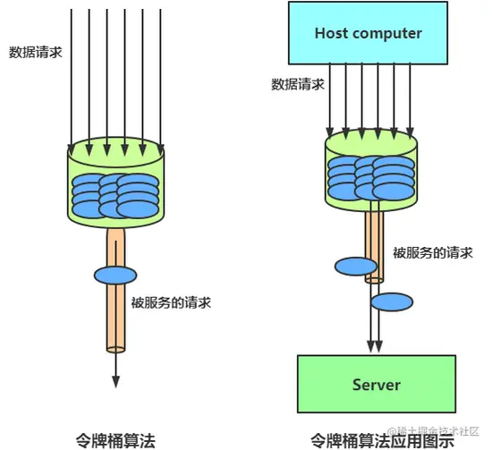 如果这时候有特殊情况,比如有些赶时间的志愿者啦、或者高三要高考啦,这种情况就是突发情况,如果也用漏桶算法那也得慢慢排队,这也就没有解决我们的需求,对于很多应用场景来说,除了要求能够限制数据的平均传输速率外,还要求允许某种程度的突发传输。这时候漏桶算法可能就不合适了,令牌桶算法更为适合。如图所示,令牌桶算法的原理是系统会以一个恒定的速度往桶里放入令牌,而如果请求需要被处理,则需要先从桶里获取一个令牌,当桶里没有令牌可取时,则拒绝服务。