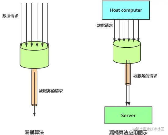 漏桶算法思路很简单,水(请求)先进入到漏桶里,漏桶以一定的速度出水,当水流入速度过大会超过桶可接纳的容量时直接溢出,可以看出漏桶算法能强行限制数据的传输速率。