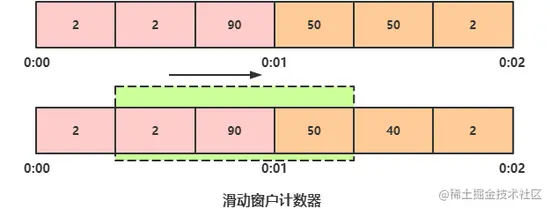 固定时间窗口算法(也就是前面提到的计数器算法)的问题是统计区间太大,限流不够精确,而且在第二个统计区间时没有考虑与前一个统计区间的关系与影响(第一个区间后半段 + 第二个区间前半段也是一分钟)。为了解决上面我们提到的临界问题,我们试图把每个统计区间分为更小的统计区间,更精确的统计计数。