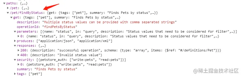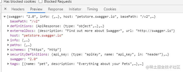 通过浏览器打开示例url:petstore.swagger.io/v2/swagger.…,打开F12进入调试模式,找到Network查看all下面的所有请求。找到swagger.json点击Preview就可以看到一个json结构的api文档。