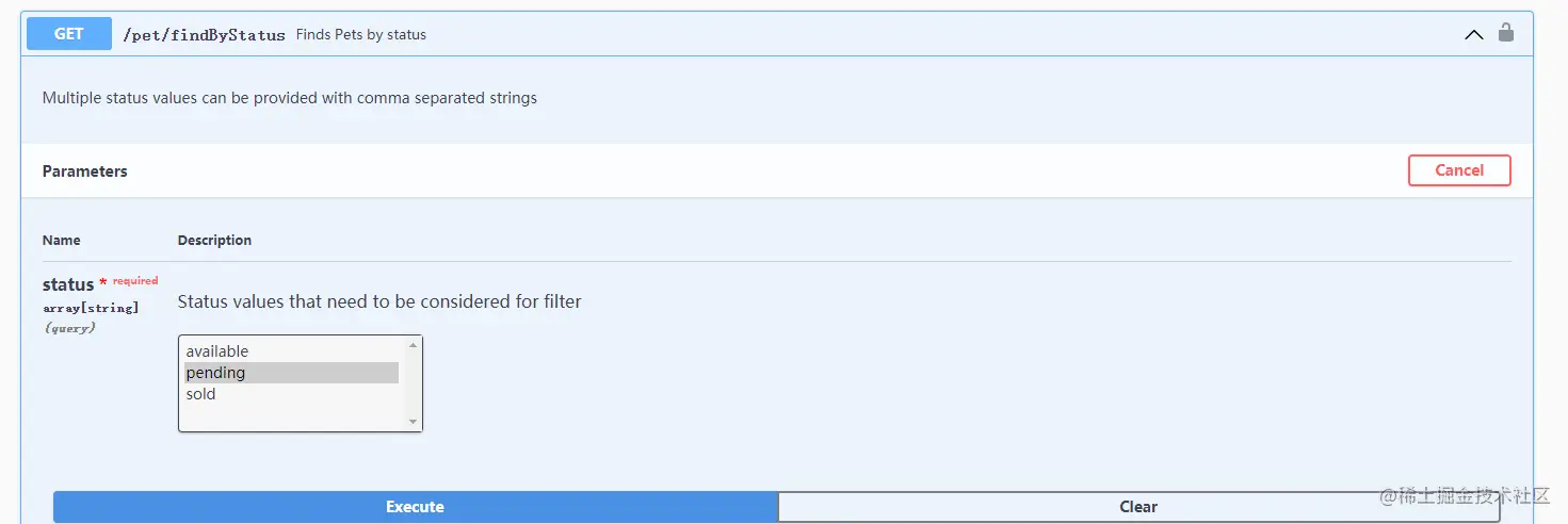 点击Parameters选择pengding.然后点击Execute。可以看到浏览器发送了一个get请求petstore.swagger.io/v2/pet/find…