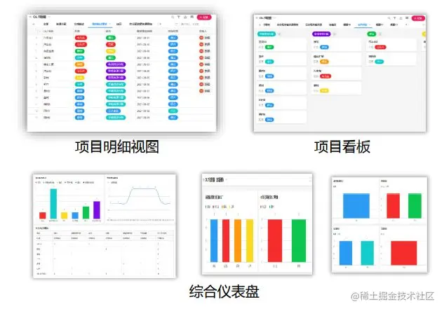- 项目情况的图形化展示: 根据不同角色的权限和关心内容,包含10个项目明细视图,1个项目看板,3个综合仪表盘,便于各环节角色快速掌握现状。