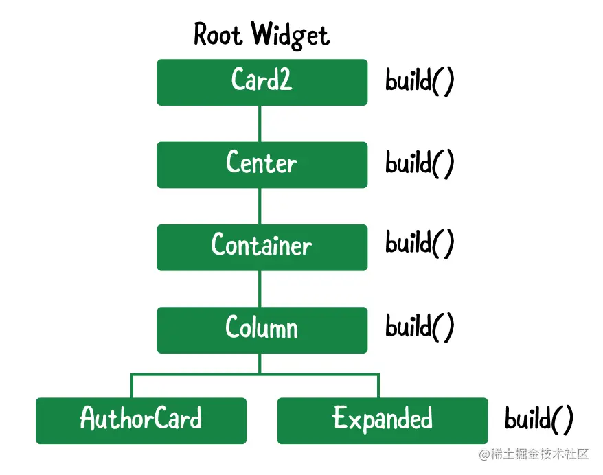 每个widget都包含一个build()方法。在这个方法中,你通过将小部件嵌套在其他小部件中来创建一个UI组合。这形成了一个树状的数据结构。每个小部件都可以包含其他小部件,通常称为子部件。下面是Card2的widget树的一个可视化图。