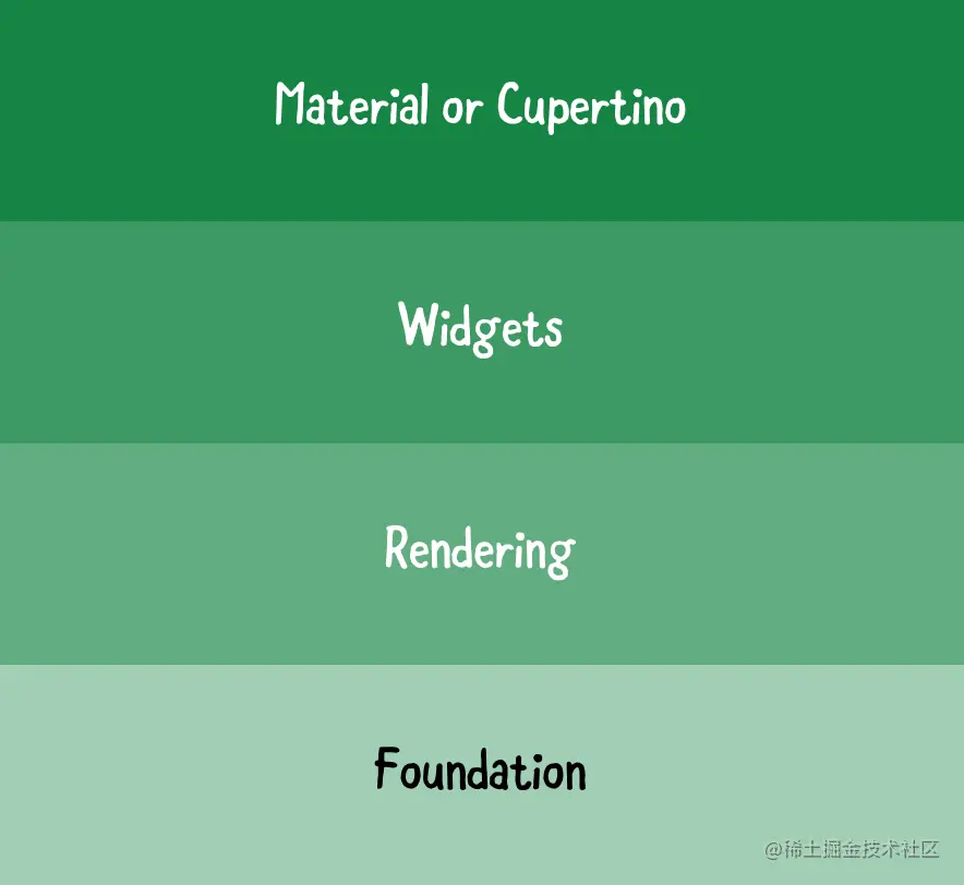 - Material和Cupertino是建立在widget层之上的UI控制库。它们分别使你的UI看起来和感觉像Android和iOS应用程序。 小部件层是小部件上的一个组合抽象。它包含了创建UI控件所需的所有原始类。在这里查看官方文档:api.flutter.dev/flutter/wid…