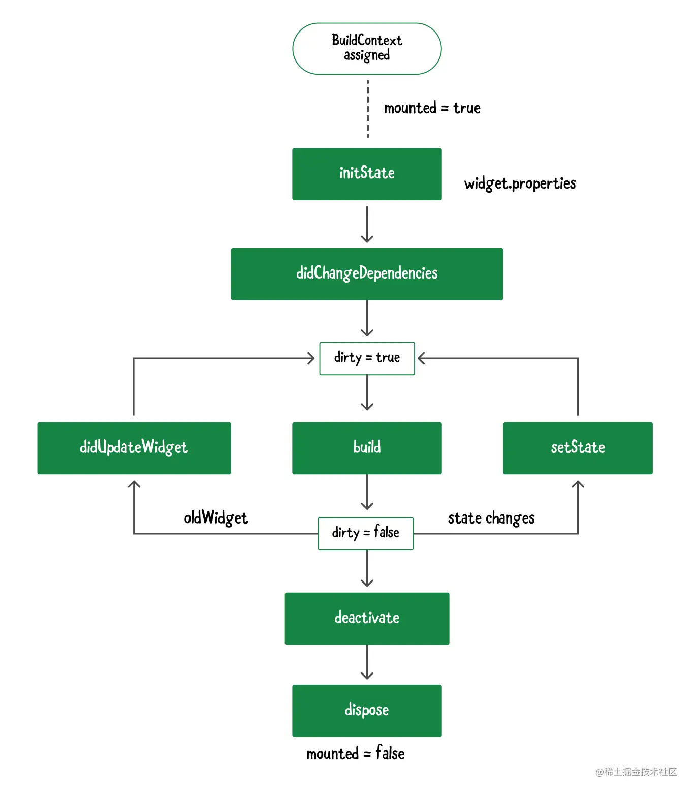 - 当你把构建上下文分配给widget时,一个内部标志, mounted,被设置为true。这让框架知道这个小组件目前在小组件树上。