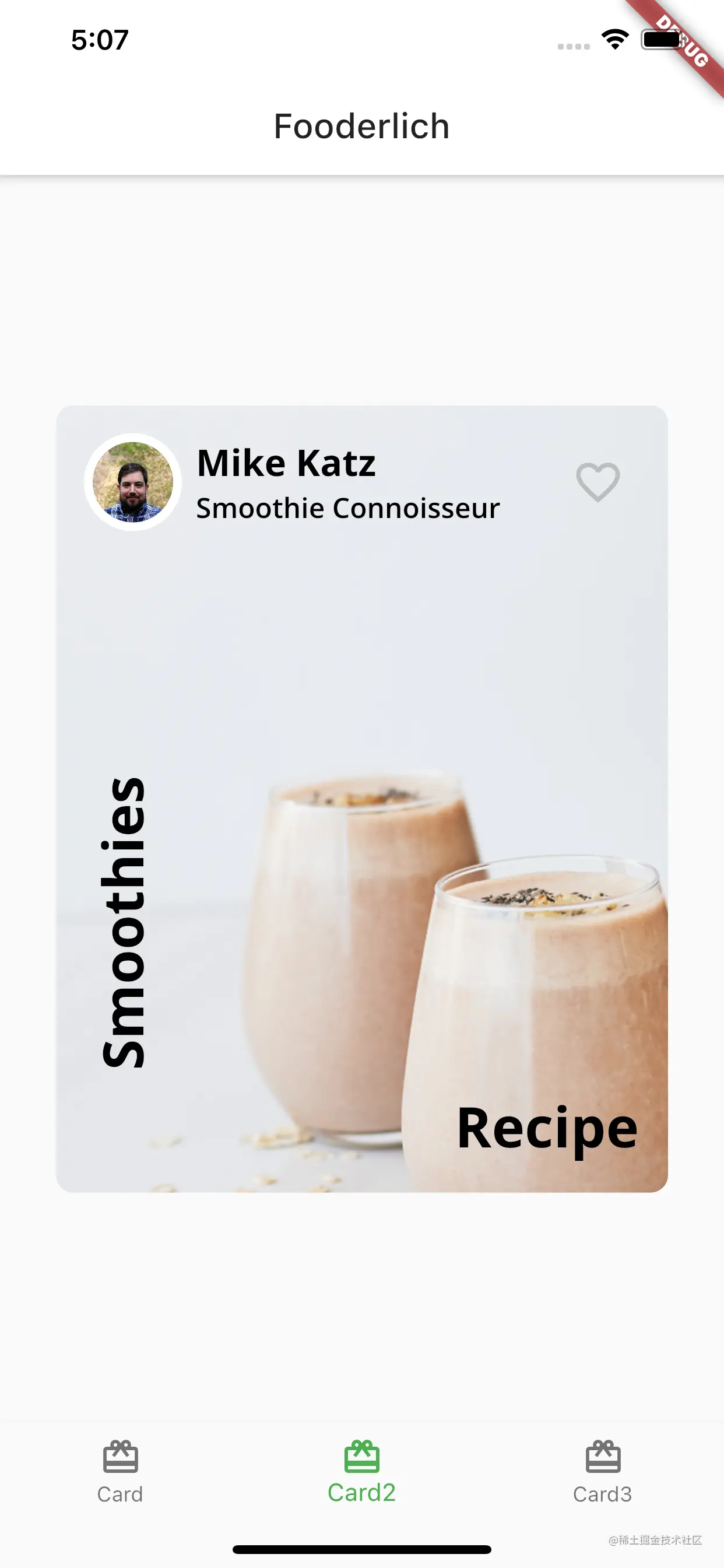 Card2目前是一个无状态Widget。注意到右上方的Heart按钮目前没有任何作用。这并不是因为你没有连接任何动作。这是因为这个小组件,就其本身而言,不能动态地管理状态。为了解决这个问题,你要把这个卡片变成一个StatefulWidget。
