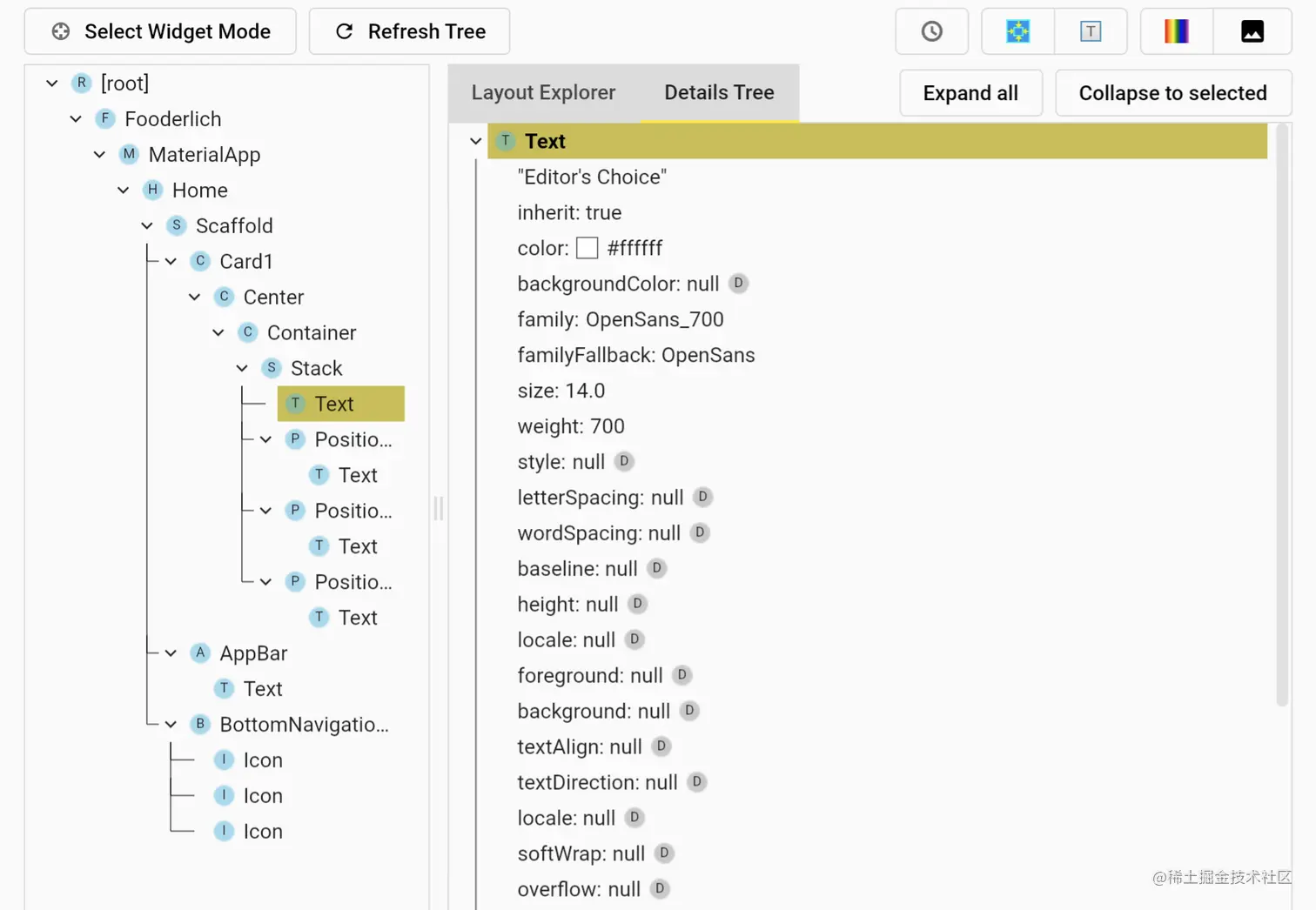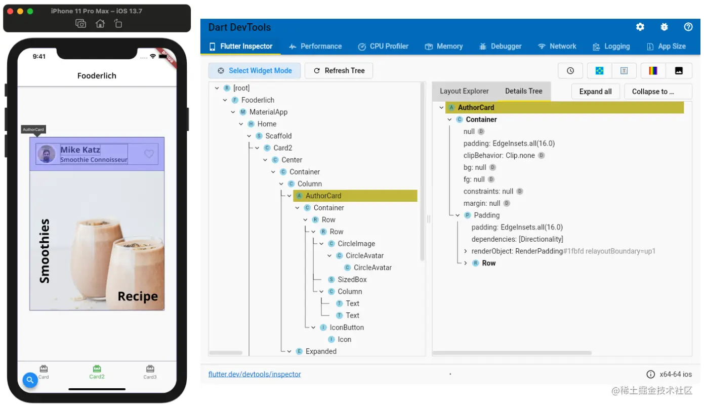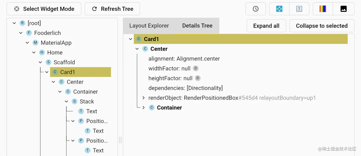 - 细节树代表了元素树,并显示了组成该部件的所有重要属性。注意,它引用了renderObject。