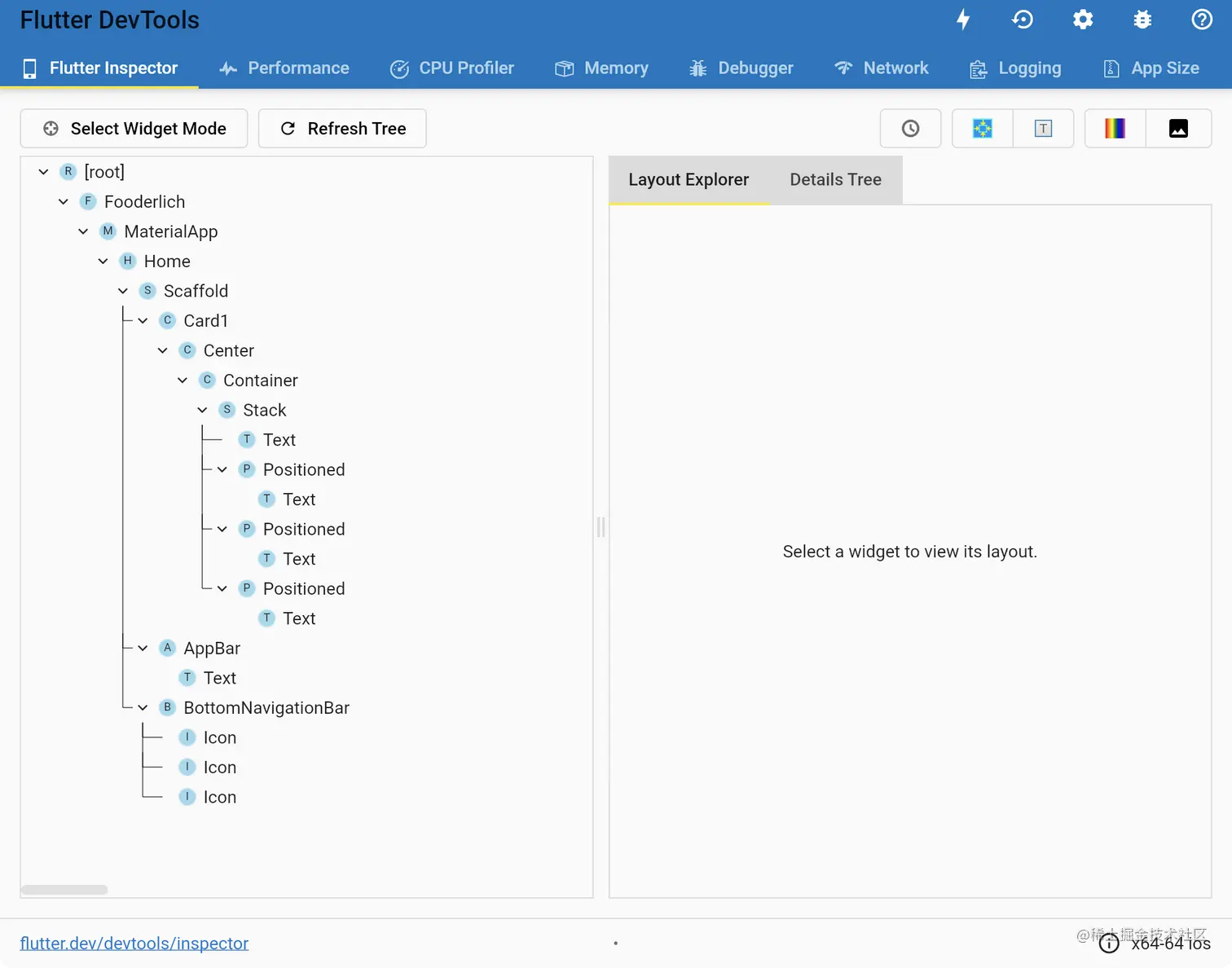 - 在左边的面板中,有一部分Flutter小部件树正在调查,从根部开始。