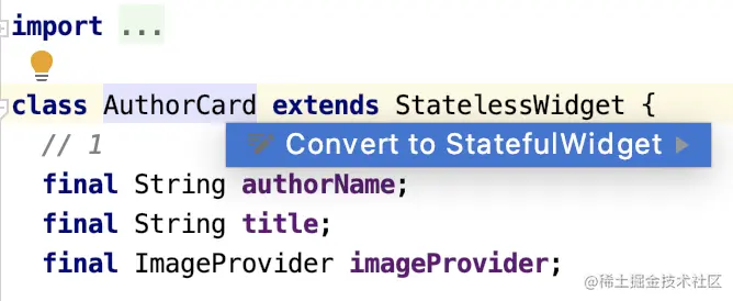 - 这个重构将AuthorCard从一个无状态的Widget转换成一个有状态的Widget。它添加了一个createState()实现。