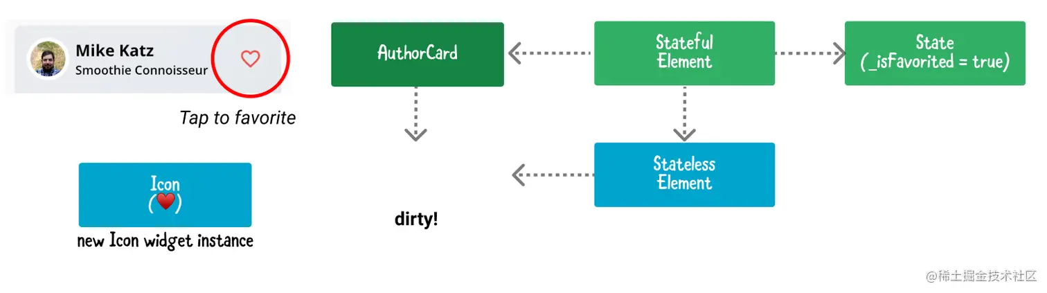 当用户点击心脏按钮时,setState()运行并将_isFavorited切换为true。在内部,状态对象将这个元素标记为脏。这触发了对build()的调用。