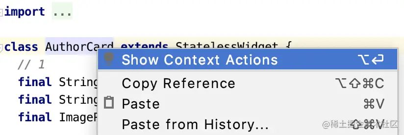 AuthorCard是嵌套在Card2中的。打开author_card.dart,右键点击AuthorCard。然后在弹出的菜单中点击显示上下文动作。