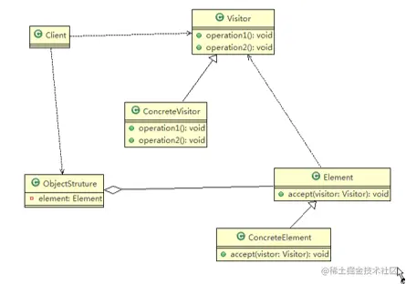 Visitor 是抽象访问者,为该对象结构中的ConcreteElement的每一个类声明一个visit操作
