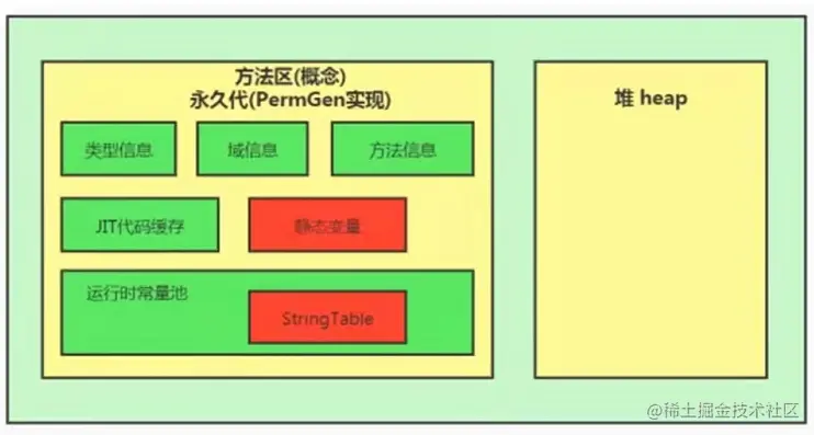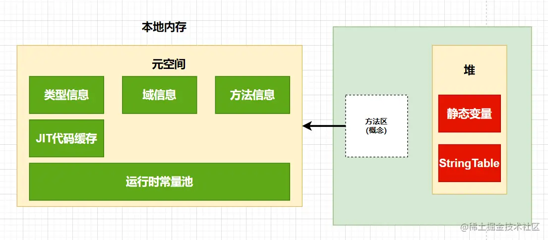 - jdk1.8及之后: 无永久代,类型信息、字段、方法、常量保存在本地内存的元空间,但字符串常量池、静态变量仍在堆中;