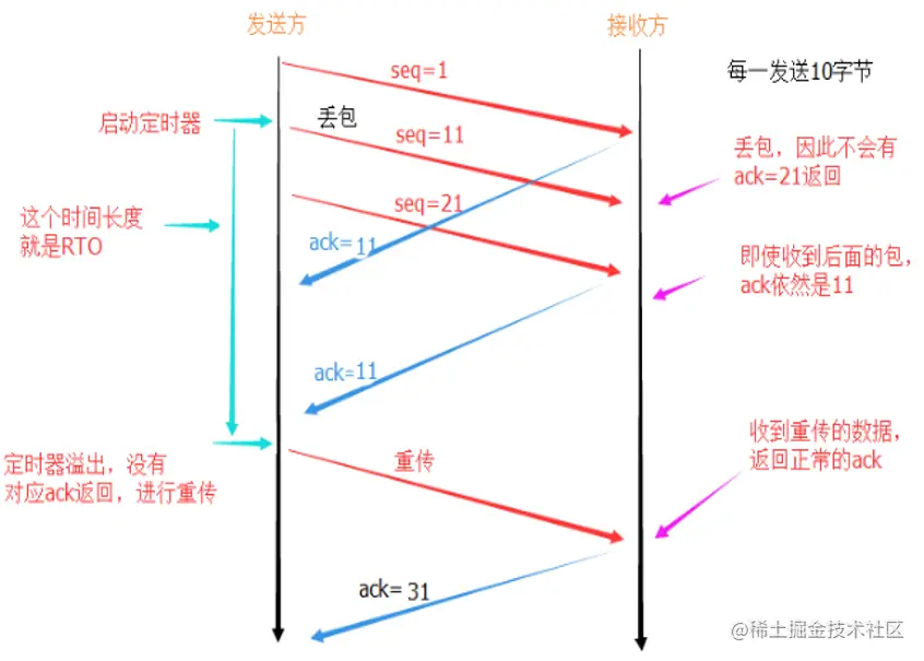 发送端连续收到3个或三个以上重复的确认报文时,即认为被重复确认的报文丢失,立即重传而不等待rto定时器的超时
