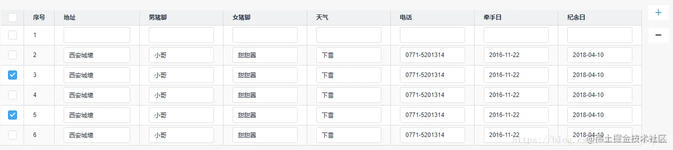 功能需求: 1、实现一个表格,可以增加行 ,可以修改每一行的数据; 2、获取选中的行的数据,获取选中行的索引; 3、根据获取的行的索引删除相应的一行的数据。