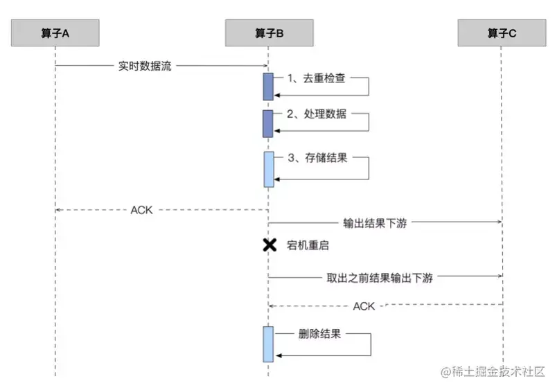因此,在仅有确定性计算的流计算系统中,实现端到端的充分必要条件可退化为:在流计算过程中,需要外部的最终结果接受端实现幂等,实时存储每一条中间和最终计算结果,如果考虑吞吐率不能存储每一条,则需定期批量存储,上述条件中去掉了对「事务」的要求的原因:如果在提交这一批数据的提交过程中又发生了异常,譬如只有部分节点的结果输出了,其他节点发生了故障结果丢失,则可以通过回到上个批次提交的状态,重算此批次数据,重算过程中,由于仅存在确定性计算,所以无论是引擎内还是引擎外,是可以通过幂等来保证数据的的一致性的。