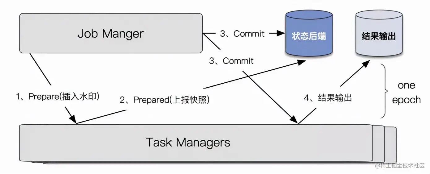 如上图所示,Flink 引擎会定时(每个周期称之为一个 epoch)以 2PC 的方式提交结果。事实上,即便不考虑结果输出,Flink 「分布式一致性快照」的快照的实现也是一个 2PC 的过程:算子的状态快照存储类似于 2PC 的 Prepare 阶段,但 Commit 的确认仅需 Coordinator( Flink JobManager) 根据「是否收到了完整算子的 ACK 」来推出是否 Commit 或 Abort。将结果输出纳入快照生成的 2PC 后,端到端一致性数据处理语义的充分必要条件在这里也得到了满足:在流计算过程中,定期(epoch)以事务(2PC)的方式进行批量存储结果(分布式一致性快照 + 写外部存储)。需要注意的是,由于 Flink 会以 epoch 为周期输出结果,因此基于此构建的流处理系统会存在一定的端到端延迟。