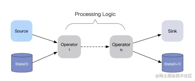 令 O(t) = Sink(t) + State(t),即将计算对引擎状态的更新视为一种特殊的输出,则流计算过程可简化为: