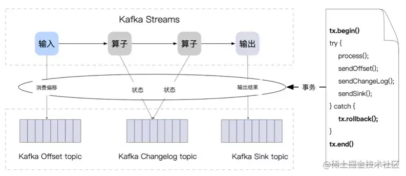 Kafka Streams 中的「结果」也以事务的方式批量持久化,但和 Flink 不同的是,这些结果是被写入不同的消息队列中: