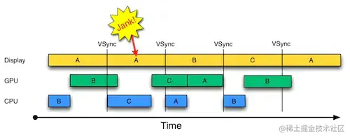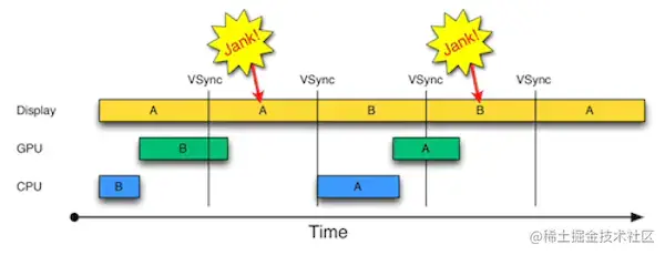 - 如图所示,A、B 代表两个帧缓冲器,当 B 没有渲染完毕时就接收到了 Vsync 信号,所以屏幕只能再显示相同帧 A,这就发生了第一次的掉帧。