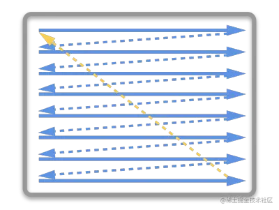 显示器的电子束会从屏幕的左上角开始逐行扫描,屏幕上的每个点的图像信息都从帧缓冲器中的位图进行读取,在屏幕上对应地显示。扫描的流程如下图所示: