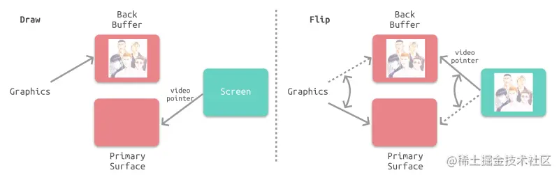 - 所以双缓冲机制会增加一个新的备用缓冲器(back buffer)。
