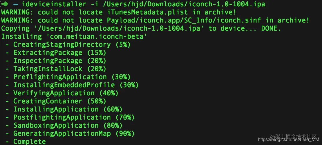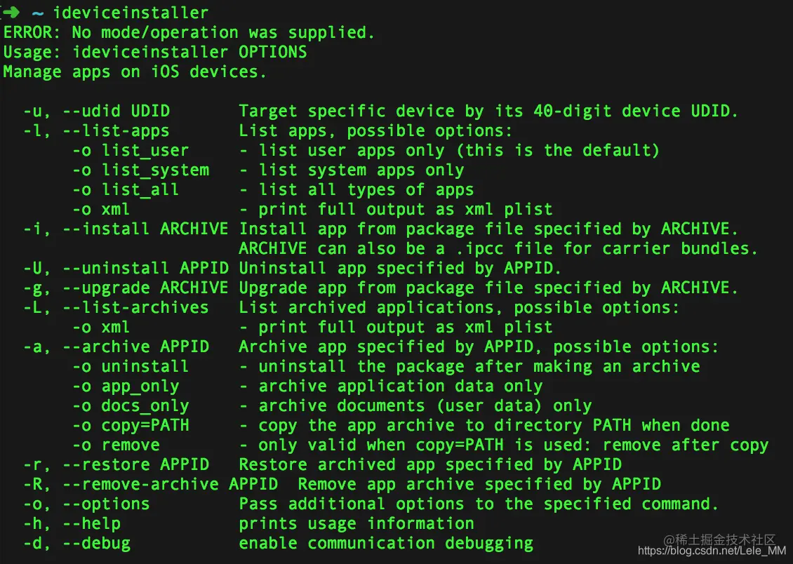 【查看是否安装】:终端输入 ideviceinstaller ,如提示下图,表示已经安装,如提示命令not found,则没有安装;