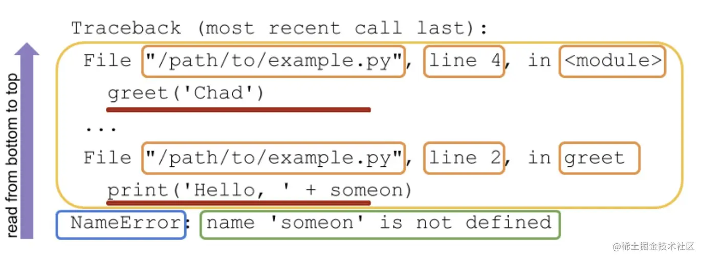 每个 Python 的 Traceback 信息都有几个重要的部分。下图显示了各个组成部分: