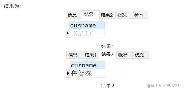 然后在过程体里面,我们输出了两次参数的结果,结果1为NULL,是因为我们的输出参数cusname还没有接收任何值,所以为NULL;