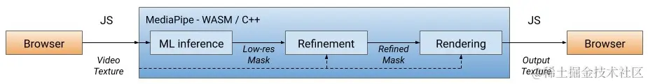我们的解决方案首先通过使用 ML 推理计算低分辨率掩码从用户的背景中分割用户来处理每个视频帧(更多关于我们的分割模型在帖子后面)。或者,我们进一步细化掩码以将其与图像边界对齐。然后使用遮罩通过WebGL2渲染视频输出,背景模糊或替换。