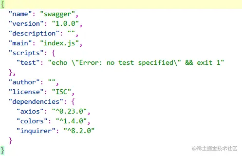 先在D盘创建一个叫做swagger的文件夹,cd 进入该文件夹。在该文件夹下执行npm init 命令,填写相关信息就会自动创建一个package.json文件。然后使用yarn 安装依赖。执行yarn add axios colors inquirer。然后所有依赖安装成功,生成如下的package.json。