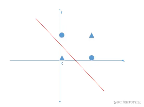 1969年,“符号主义”代表人物马文·明斯基(Marvin Minsky)提出XOR问题:xor即异或运算的函数,输入两个bool数值(取值0或者1),当两个数值不同时输出为1,否则输出为0。如下图,可知XOR数据无法通过线性模型的边界正确的区分开