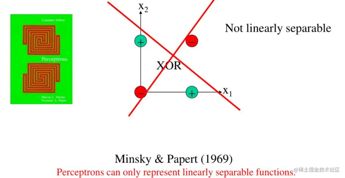 由于单层神经网络线性,连简单的非线性的异或函数都无法正确的学习,而我们经常希望模型是可以学习非线性函数,这给了神经网络研究以沉重的打击,神经网络的研究走向长达10年的低潮时期。
